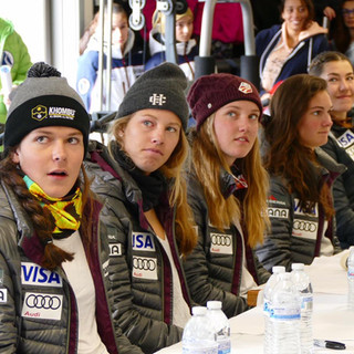 After a Thanksgiving day spent with family and friends, the KMS community reconvened on campus for a very special opportunity Friday afternoon. Members of the U.S. Ski Team arrived on campus to sign autographs and answer questions for a crowd of admiring fans of all ages. Members of the Killington Ski Club and the Killington Elementary School, including many young Development team athletes of all disciplines were on hand, along with multiple members of the media, thrilled at the chance to get up close and personal with some of their role models. Head of School Tao Smith gave a brief introduction, and after a welcome by USSA President and CEO Tiger Shaw, the US Team members all answered questions about their sport, their training and their lives for the enthusiastic crowd. Then the signing began, and the women stayed until every single poster, hat, race suit, program, and/or photo was autographed, smiling and answering questions as each person moved through the line. The opportunity to interact with such amazing athletes was one for which we are all eternally grateful. We recognize that time and rest are precious, and so we extend our deepest gratitude to the U.S. Ski Team for this amazing opportunity.