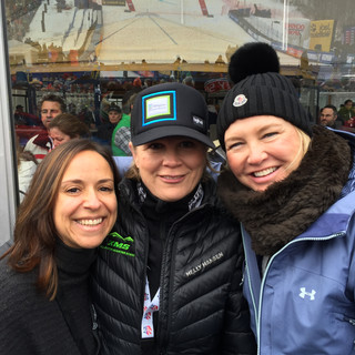 The crowd really was amazing and in fact, was the biggest crowd ever in history for a women's World Cup race. The stands were full of cheering, smiling faces, and noise made by cowbells and by the green "banger stix" adorned with KMS and KSC logos that were handed to spectators at the KMS tent in the World Cup village. The surface proved to be challenging on Saturday, as were the weather conditions, with fog and afternoon snow, and a course that got choppy as the day went on. In the end, it was France's Tessa Worley who took the top spot on the podium, with Norway's Nina Loseth in second and Italy's Sofia Goggia in third. The day was capped off by an awesome performance by the band O.A.R, with happy fans dancing along to the music under snowy skies. It was straight from the hill and down to the KMS Alumni Gathering held at the beautiful Highline Lodge for many, and the evening was the perfect way to celebrate the day's success with friends.